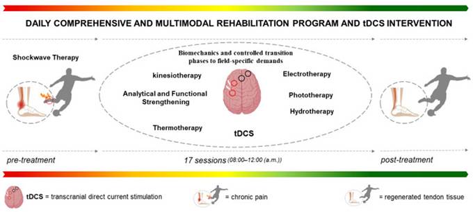 The flowchart details the intervention sequence, starting from the baseline diagnosis, followed by the preparatory focused shockwave therapy and the subsequent experimental phase consisting of 17 tDCS sessions integrated with the club's multimodal rehabilitation program.