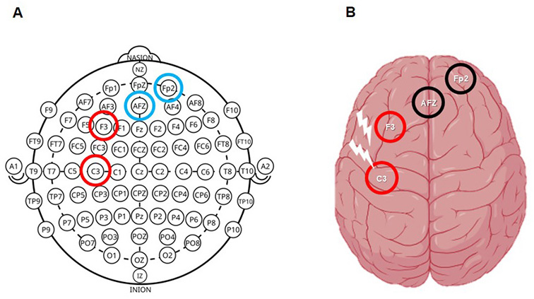 A) Schematic representation of the international 10/10 system for EEG electrode placement in the present report (red = anodal; blue = cathodal). Cap for 128 channels. B) Cortical projection of selected electrodes (F3, C3, AFz, and Fp2). (red = anodal; black = cathodal).