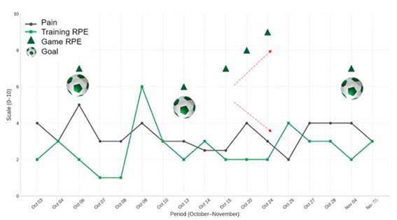This time-series plot shows the progression of the player's subjective measures over 17 sessions (October 3rd to November 5th); PAIN (VAS) (Black Line): Tracks the visual analog scale score (0-10); Training RPE (Green Line): Tracks the subjective perceived exertion for training (CR-10 scale); Match RPE (Green Triangles): Tracks the subjective perceived exertion for matches (CR-10 scale); Goal (Soccer Ball Icon): Indicates when the athlete scored a goal.