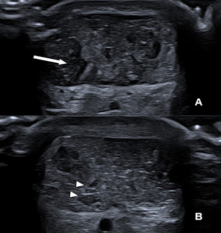 Initial Assessment (A): Axial view of the mid-portion of the Achilles tendon showing a focal area of hypoechogenicity involving the lateral and deep fibers, consistent with a partial-thickness tear. Note the presence of thin, anechoic laminar fluid (arrow) within the defect, with no evidence of complete fiber discontinuity. 30-Day Follow-up (B): The follow-up scan demonstrates significant structural remodeling. The previously identified hypoechoic defect is now filled with more organized, echogenic tissue, representing the formation of organized scar tissue and the resolution of the peritendinous fluid.