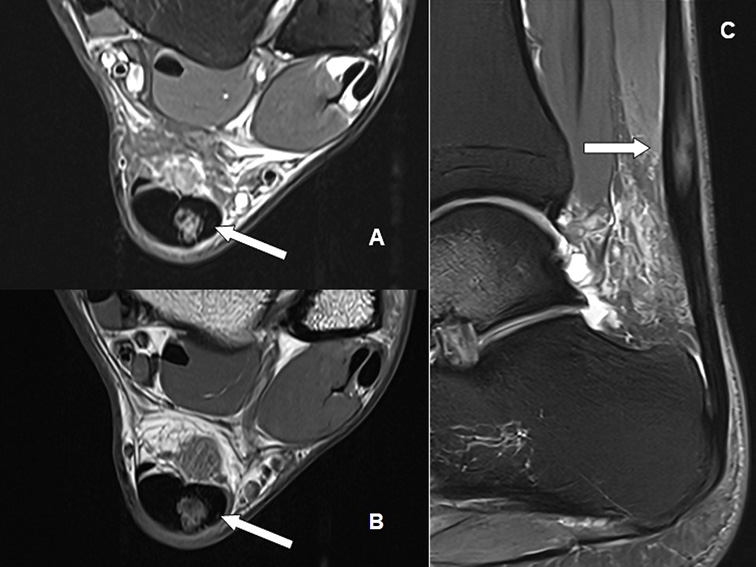 Axial T2-weighted sequence with fat saturation (A); axial T1-weighted sequence (B), and sagittal T2-weighted sequence with fat saturation (C). Note the intermediate signal tissue filling the partial tear area in the Achilles tendon body (white arrows).