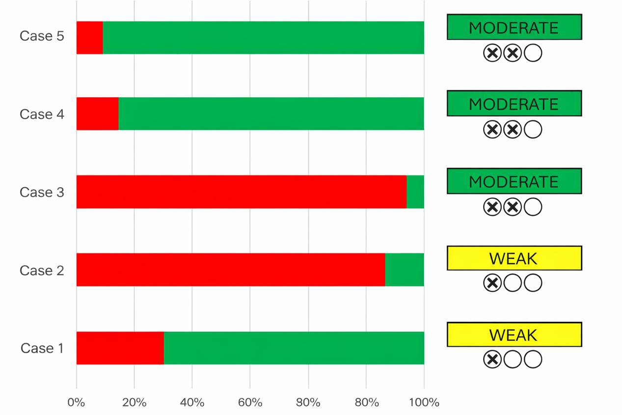 Legend: The bars represent the proportion (%) of responses for each clinical case, considering the total number of respondents. The green color indicates agreement with the proposed management, whereas the red color indicates disagreement. To the right of each case, the GRADE system levels are displayed, expressed by the quality of evidence (weak or moderate) and the strength of the recommendation, according to the graphical symbols.