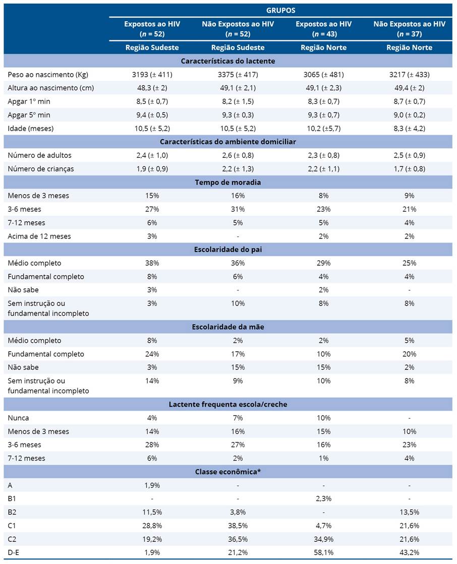 A amostra foi composta por 184 lactentes, sendo 104 da Região Sudeste (52 no grupo exposto ao HIV e 52 no grupo não exposto) e 80 da Região Norte (43 lactentes no grupo exposto ao HIV e 37 no grupo não exposto). A tabela 1 apresenta as medidas descritivas referentes às características dos lactentes ao nascimento (peso, altura, índice de Apgar no 1º e 5º minuto após o nascimento e idade em meses) e ao ambiente (número de adultos e crianças no mesmo domicílio, escolaridade dos pais, frequência à creche e/ou escola e classe econômica), de acordo com o grupo e a região.