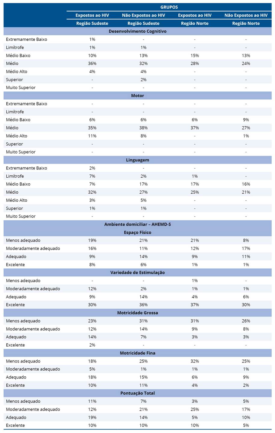 Com relação as oportunidades do ambiente domiciliar apresentadas na tabela 3 avaliadas utilizando o AHEMD-IS, observou-se que, na dimensão espaço físico, os grupos expostos e não expostos ao HIV, bem como as regiões Sudeste e Norte, foram classificados como menos adequados. Na dimensão variedade de estimulação, ambos os grupos e regiões foram classificados como excelentes. Contudo, nas dimensões motricidade grossa e motricidade fina, ambos os grupos e regiões foram classificados como menos adequados. Por fim, na dimensão pontuação total, ambos os grupos e regiões foram classificados como moderadamente adequados.