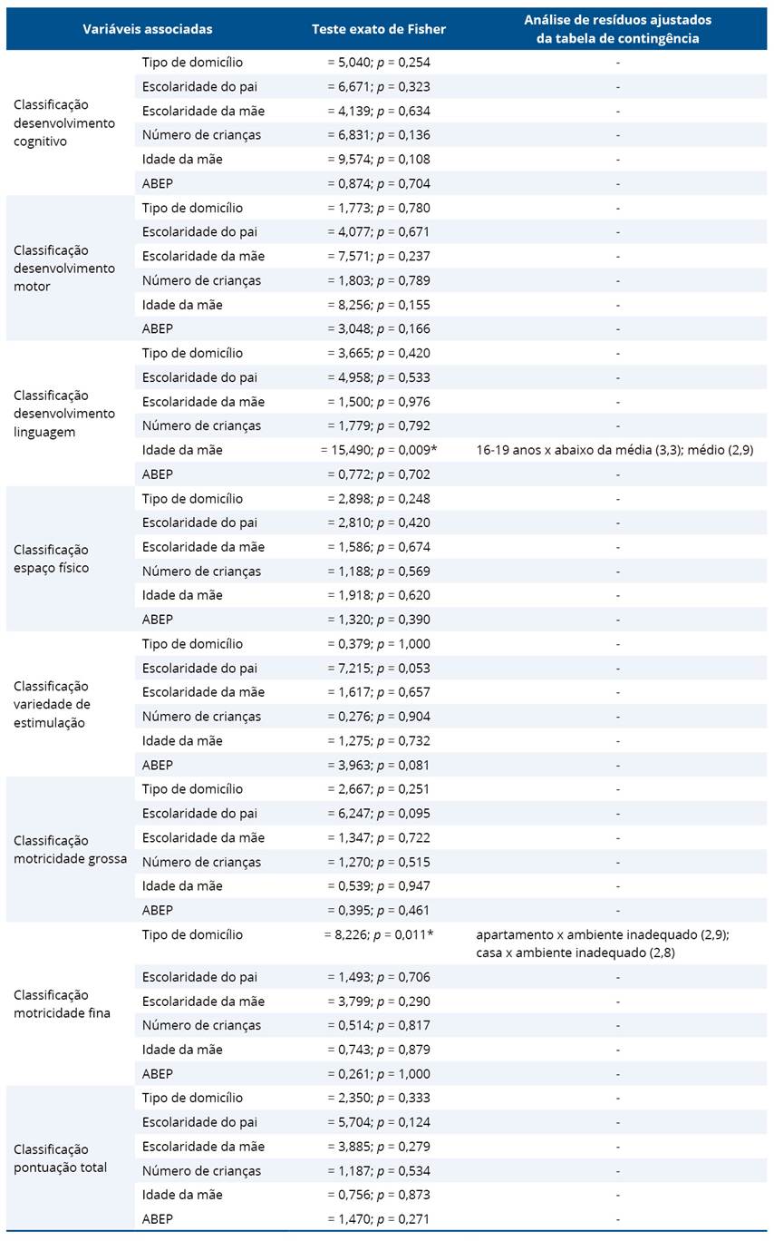 O teste exato de Fisher foi utilizado para verificar a associação entre as classificações de desenvolvimento avaliadas pela Escala Bayley-III, as affordances do ambiente domiciliar no AHEMD-IS e as demais variáveis do estudo, com análise de resíduos ajustada para detectar associações. Um nível de significância de 5% foi considerado. Todas as análises foram realizadas utilizando o SPSS Statistics versão 24.