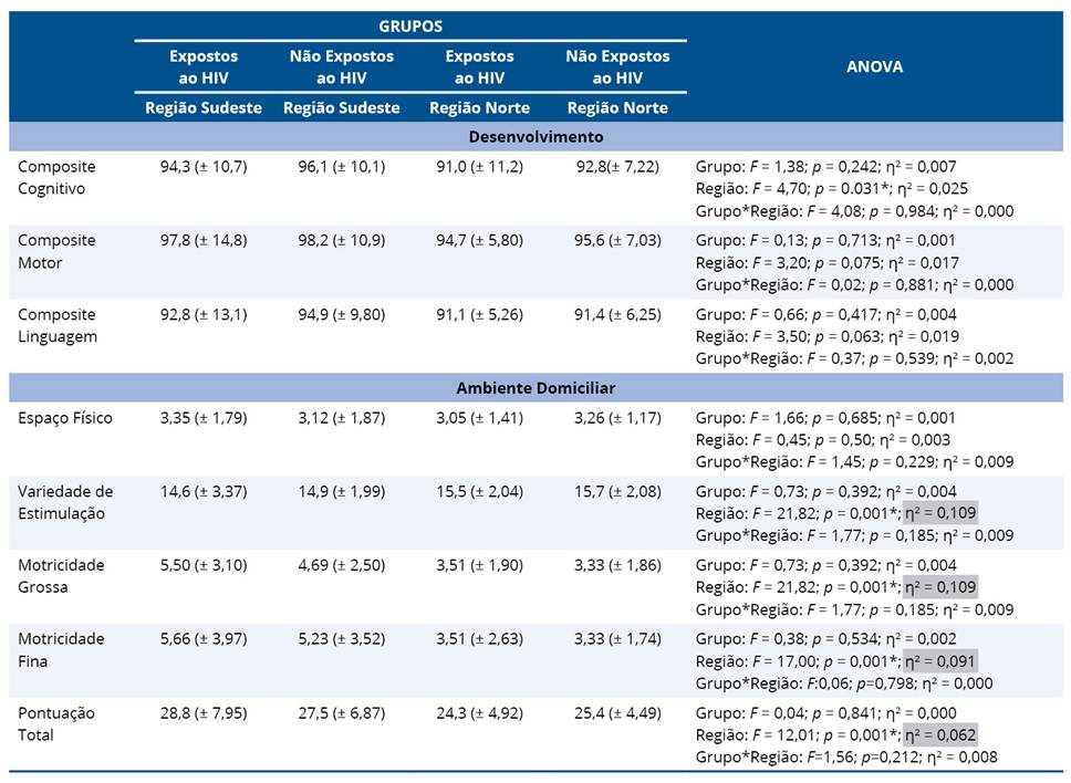 A ANOVA de dois fatores foi utilizada para avaliar se houve efeito das variáveis dependentes avaliadas pela Escala Bayley-III (composite cognitivo, composite motor e composite da linguagem) e pelo AHEMD-IS (espaço físico, variedade de estimulação, motricidade grossa, motricidade fina e pontuação total) em relação às variáveis independentes (grupos expostos e não expostos ao HIV e regiões Sudeste e Norte), bem como se houve efeito da interação entre grupo*região. O teste foi escolhido devido aos parâmetros de normalidade e homogeneidade da amostra. Uma análise foi realizada para cada variável dependente, considerando um nível de significância de 5%, e os tamanhos do efeito foram apresentados em eta-squared (η²), com os seguintes valores de referência: 0,01 a 0,05, indicando tamanho do efeito pequeno; 0,06 a 0,13, tamanho do efeito médio; valores iguais ou maiores que 0,14, tamanho do efeito grande.