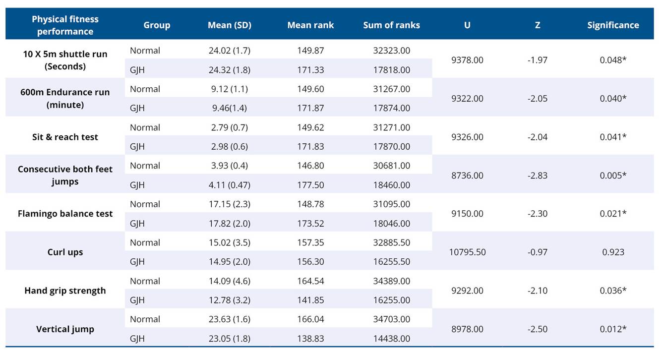 Table 2. Mann Whitney U test for Physical fitness variables among children with and without generalised joint hypermobility