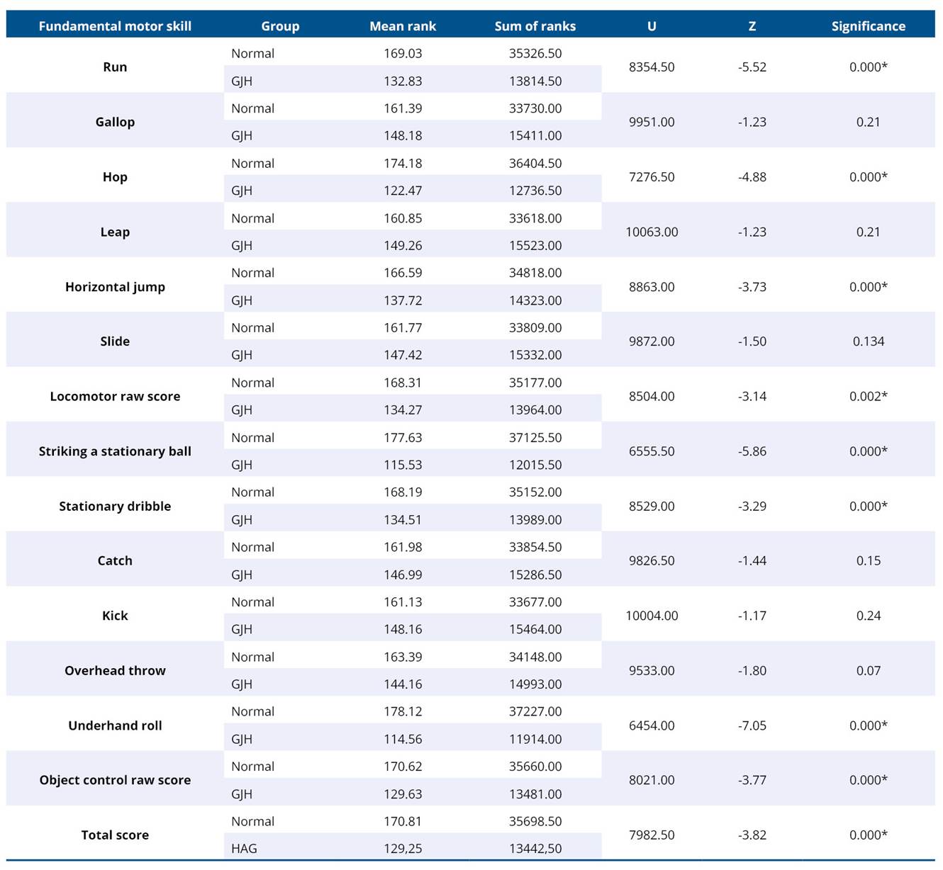 Table 3. Mann Whitney U test for fundamental motor skill variables among children with and without generalised joint hypermobility