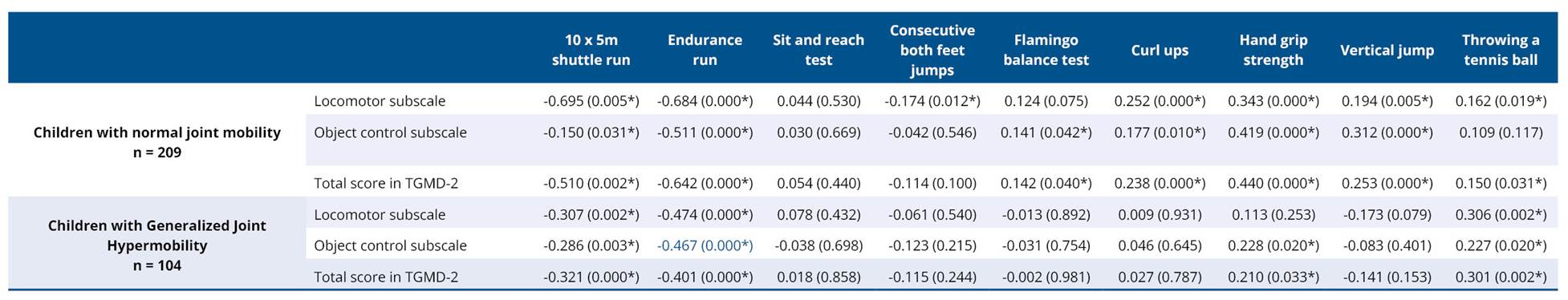 Table 4. Spearman's rho correlation coefficients (r) for fundamental motor skill and physical fitness variables in children with normal joint mobility and children with generalized joint hypermobility