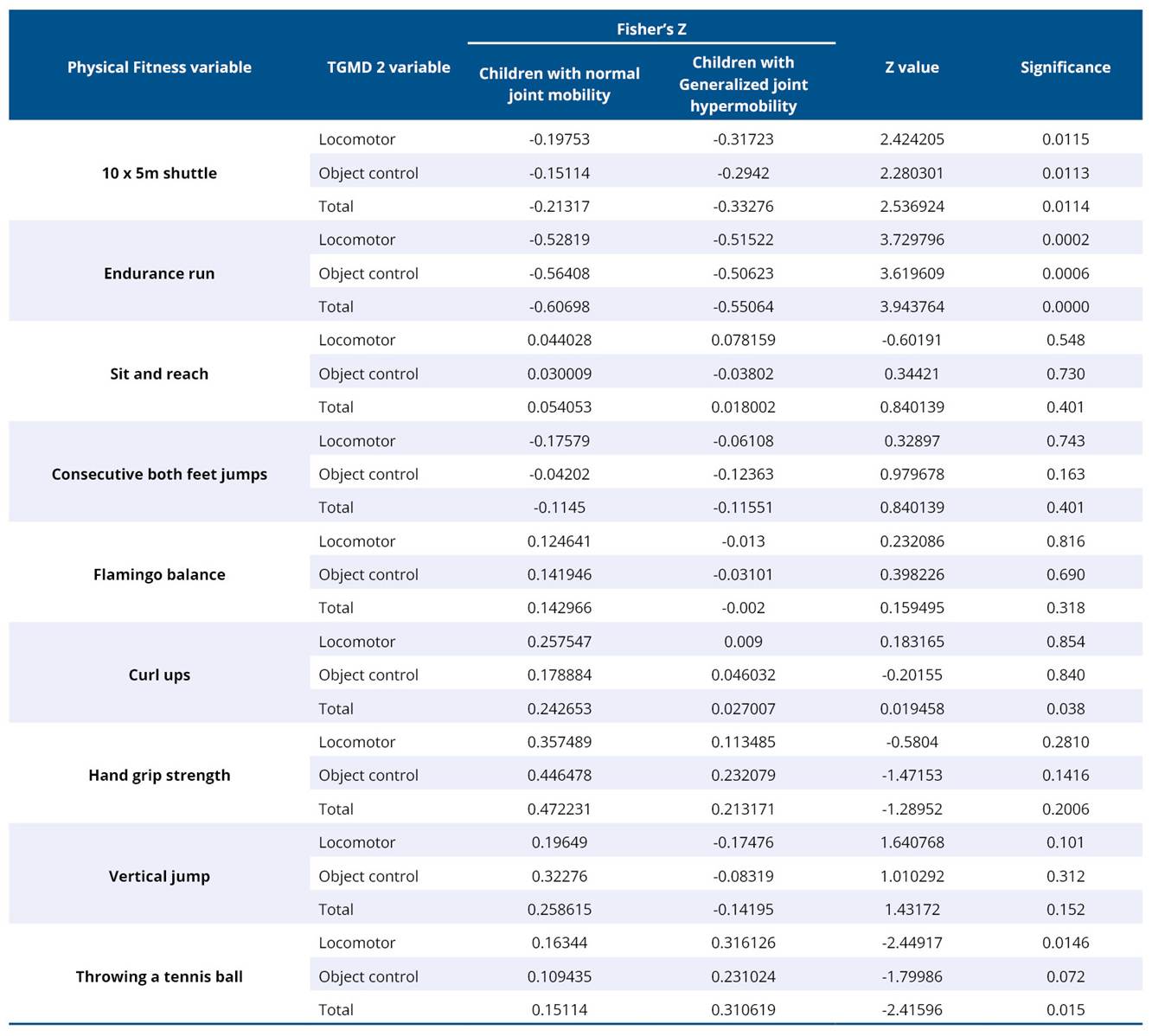 Table 5. Comparison of correlation coefficients between normal and hypermobile children using Fisher's z-test