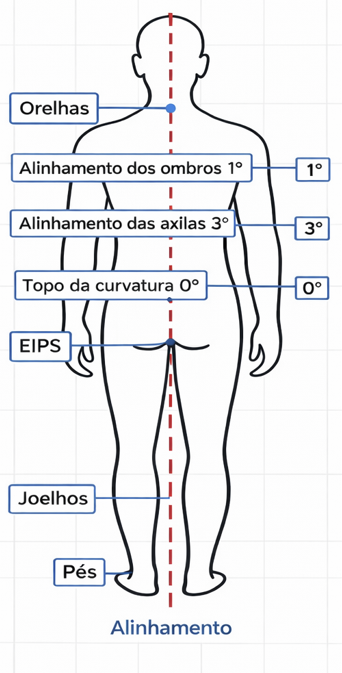 · Vista posterior: inclinação da EIPS (espinha ilíaca posterossuperior), alinhamento vertical do corpo e assimetria escapular.