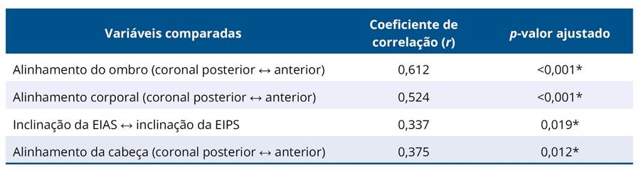 Tabela 3. Correlação de variáveis posturais entre planos anatômicos (ajustado de Benjamini–Hochberg)