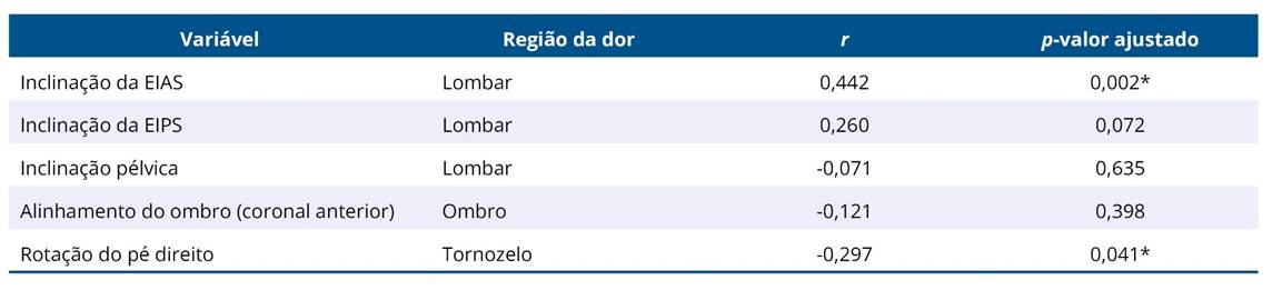 Correlações entre desvios posturais e dor musculoesquelética, avaliadas usando o Questionário Nórdico de Sintomas Musculoesqueléticos (QNSM) e a Escala Numérica da Dor (NPRS), são apresentadas na Tabela 4. A associação mais forte foi entre a inclinação da EIAS e a dor lombar (r = 0,442, p = 0,002, ajustado por FDR). A inclinação da EIPS mostrou uma associação fraca e não significativa (r = 0,260, p = 0,072). Não foram observadas correlações significativas para inclinação pélvica ou alinhamento do ombro com a intensidade da dor. A rotação do pé direito estava inversamente correlacionada com dor no tornozelo (r = −0,297, p = 0,041).