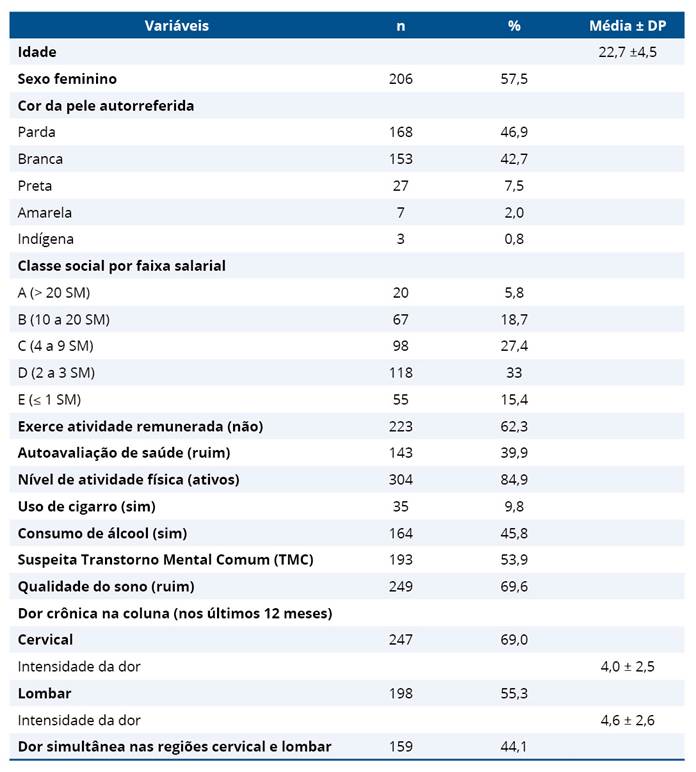 Tabela 1. Características demográficas, prevalência de dor crônica na coluna e fatores biopsicossociais dos universitários. Fortaleza, Ceará, Brasil, 2022