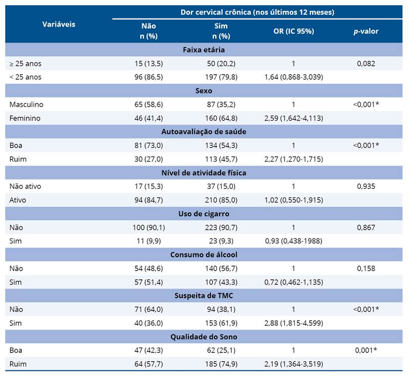 Tabela 2. Relação entre prevalência de dor cervical crônica e fatores biopsicossociais dos universitários. Fortaleza, Ceará, Brasil, 2022