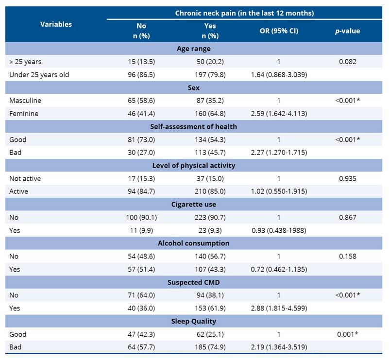 Table 2. Relationship between prevalence of chronic neck pain and biopsychosocial factors among university students. Fortaleza, Ceará, Brazil, 2022