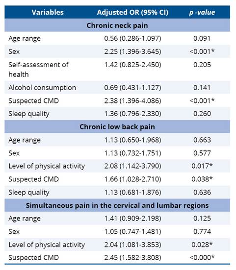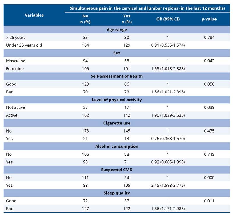 In the bivariate analysis, it was observed that simultaneous pain in the cervical and lumbar regions was significantly associated with female sex (OR=1.55; p=0.042), poor self-rated health (OR=1.56; p=0.050), being physically active (OR=1.90; p=0.039), suspected CMD (OR=2.45; p=<0.001) and poor sleep quality (OR=1.86; p=0.011) (Table 4).