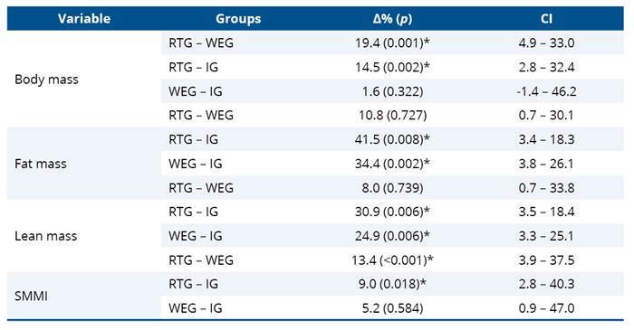 * p < 0,05; RTG: Resistance Training Group; WEG: Water-based Exercise Group; IG: Inactive group; SMMI: Skeletal Muscle Mass Index.