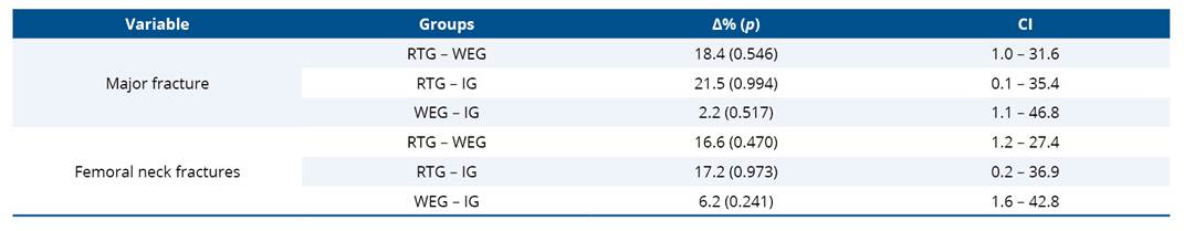 Regarding fracture risk estimates, no statistically significant differences were observed between groups, according to FRAX-derived measures (Table 4).
