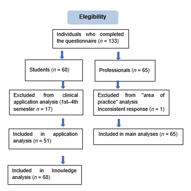 Data collection began through the application of a questionnaire developed by the researchers based on scientific literature1,4,23. The instrument consisted of objective multiple-choice questions with only one correct answer for the theoretical questions and four alternatives. Answers were considered correct when they were in accordance with the theoretical references adopted in the construction of the instrument. The variable “area of practice” was structured with objective options representing established fields of professional practice, including the alternative “others”, with an open field for additional specification. The first stage was to invite participants and read the Informed Consent Form, agreeing to the document, then participants answered questions from the second and third stages. After that, sociodemographic data (gender, age) and information about academic background (whether they were professionals or students, level of education, and area of expertise) were collected. In the third stage, variables about knowledge and application of exercise periodization in rehabilitation were collected, including questions about volume, intensity, types of periodization, concepts, and clinical application. The questions in this block were made available as supplementary material. Regarding the application questions, 17 responses from students in their 1st to 4th semesters were disregarded exclusively in the analyses related to the clinical application of periodization, considering that there is no supervised internship during this period. In addition, one response referring to the variable “area of practice” was excluded due to inconsistency with the question asked, while the other information provided by this participant remained valid (Figure 1).