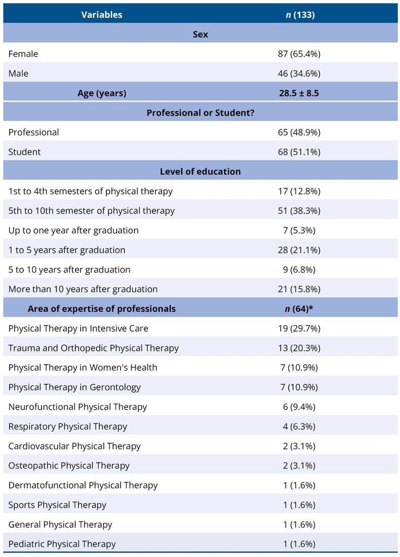 A total of 133 participants were included in the study, of whom 65.4% were female (Figure 1). The mean age of the participants was 28.5 ± 8.5 years. Approximately half of the sample, 48.9%, consisted of physical therapy professionals. Regarding students, 38.3% were between the 5th and 10th semesters. Regarding the area of practice of physical therapy professionals, Intensive Care Physical Therapy accounted for 29.7% of professionals (Table 1).