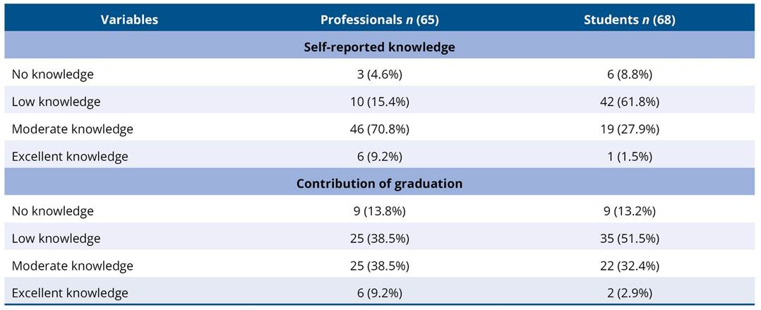 Regarding self-reported knowledge about exercise periodization, 70.8% of professionals classified themselves as having “moderate knowledge,” and 61.8% of students classified themselves as having “low knowledge”. Regarding the contribution of undergraduate education to knowledge in the area, it was classified as “low knowledge” and “moderate knowledge” (38.5% each) among professionals, and 51.5% of students classified it as “low knowledge” (Table 3).