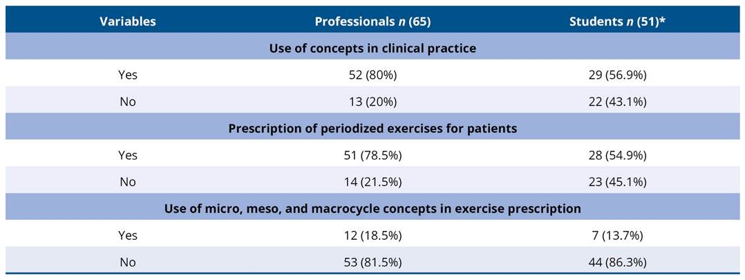 Regarding the use of exercise periodization concepts, 80% of professionals and 56.9% of students reported using them in clinical practice. In addition, 78.5% of professionals and 54.9% of students reported prescribing periodized exercises to patients. However, regarding the use of micro, meso, and macrocycle concepts in exercise prescription, 81.5% of professionals indicated that they do not use them (Table 4).