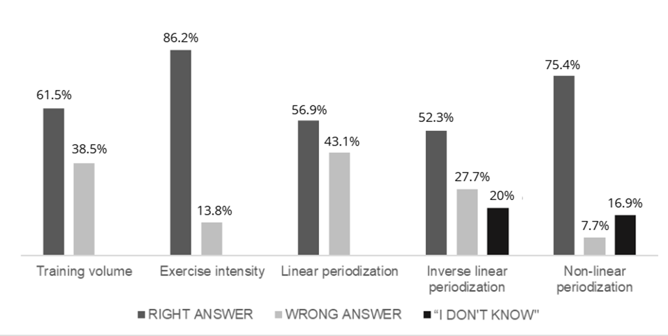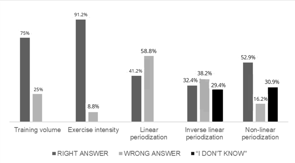 In Graph 1, 86.2% of professionals answered correctly the question about exercise intensity. In the question about linear periodization, 43.1% answered incorrectly. In the students' assessment, 58.8% answered the question about linear periodization incorrectly, and 91.2% answered correctly the question about exercise intensity (Graph 2).