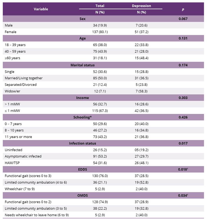 The overall prevalence of major depression was 33.9% (58/171). Significant differences in prevalence were observed (p=0.017) across different infection statuses: absence of HTLV-1 (19.2%), asymptomatic infection (29.7%), and HAM/TSP (48.1%). Depression was more commonly observed among individuals with greater reductions in functional capacity regardless of the scale administered (OMDS or EDSS). Although not statistically significant, depression was more prevalent among women (37.2% vs. 20.6%) and elderly individuals (≥ 60 years: 48.4%) than among those aged 18-39 years (33.8%) or 40-59 years (28.0%) (Table 2).