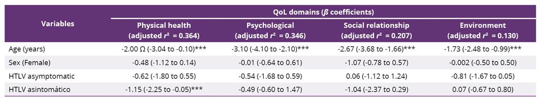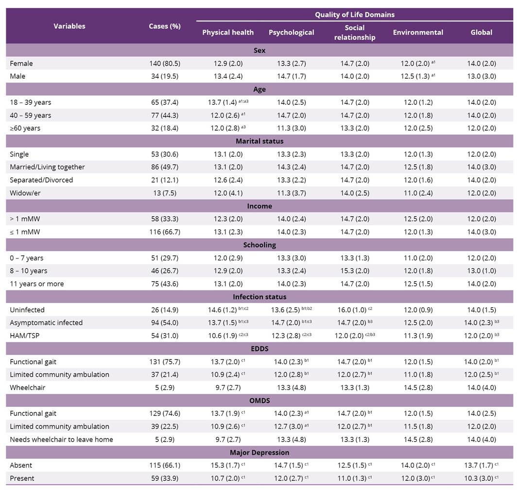 Bivariate analysis revealed the presence of HAM/TSP to be associated with lower overall QoL scores and lower scores in the physical, psychological, and social relationship domains than in asymptomatic individuals (p<0.001). Additionally, compared to uninfected individuals, asymptomatic patients presented lower QoL scores in the physical health domain (p=0.039).